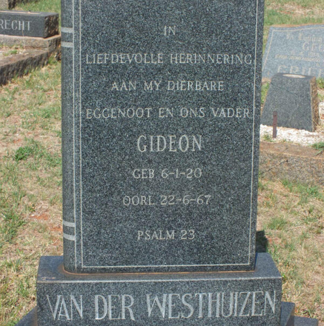Gideon was die seun van Gert Christiaan van der Westhuizen en Gesina Wilhelmina van Zyl.