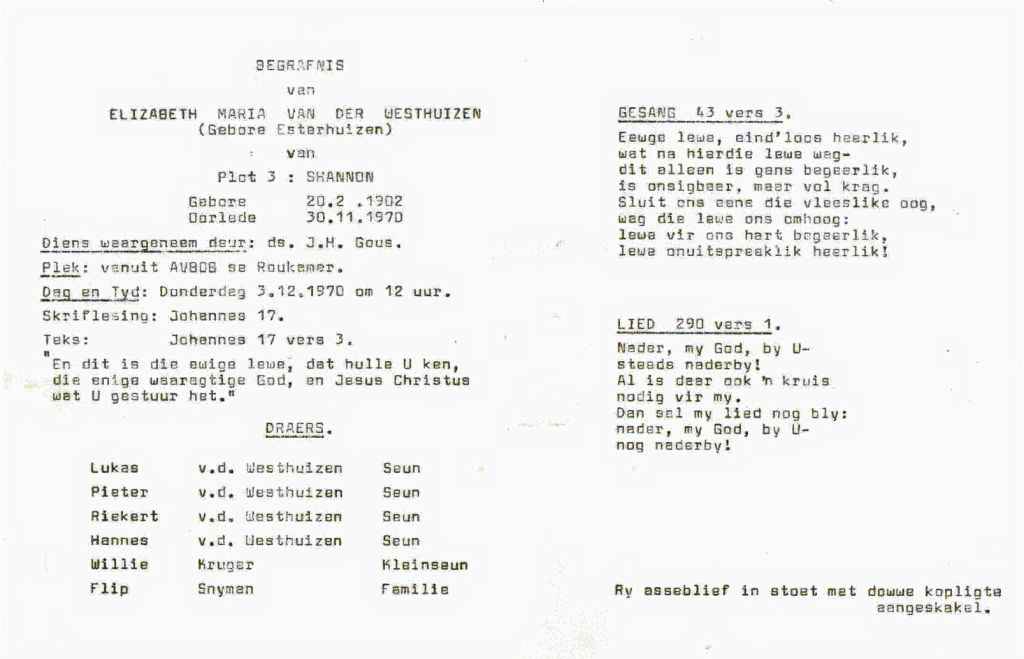 h.1. Petrus Andries Jacobus, geb. 05/12/1892, ged. 28/04/1892, Willowmore x 07/07/1919, Rietbron, Willowmore met Elizabeth Maria ESTERHUIZEN, geb. 20/02/1902, oorl. 30/11/1970, d.v. Andries Jacobus Esterhuizen en Johanna Cornelia Susanna Elizabeth van Eck.